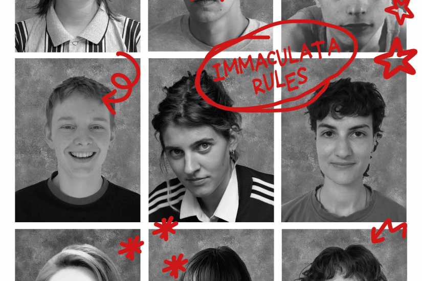 Immaculata volgt het relaas van vier jongeren tijdens de laatste nacht (en ochtend) van hun leven. Ze hebben het over jong geluk. Of ongeluk. Over blijde verwachtingen. Of het gebrek eraan. Maar op de achtergrond klinken steevast de naderende voetstappen van gewapende medeleerlingen, die op weg zijn om aan al die verwondering over dit leven abrupt een einde te komen maken.